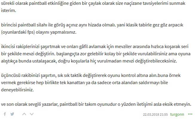 Oyuna gelmeden önce okunan paintball yorumları oyuncular tarafından dikkate alınmaktadır. Bu bağlamda internet siteleri ve Google aramalarında aranan paintball oyunu yorumları ve eleştirilerinden bazılarını derledik. Yorumlar çoğunlukla oyun sonrası yapılmıştır ki genelde bu oyunun tehlikeli mi yoksa güvenli mi olduğundan pek bahsedilmemiştir. Yapılan yorumlara siz de görüş ekleyebilirsiniz.